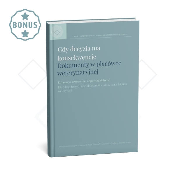 E-book dla placówek weterynaryjnych, które chcą domykać decyzje zanim pojawi się problem przy eutanazji, zrzeczeniu się zwierzęcia lub w sytuacjach granicznych odpowiedzialności: zgoda na eutanazję, ustalenia po eutanazji, zrzeczenie, decyzje podejmowane pod presją czasu – tak, aby zespół miał jasny punkt odniesienia, a odpowiedzialność nie wracała po czasie.